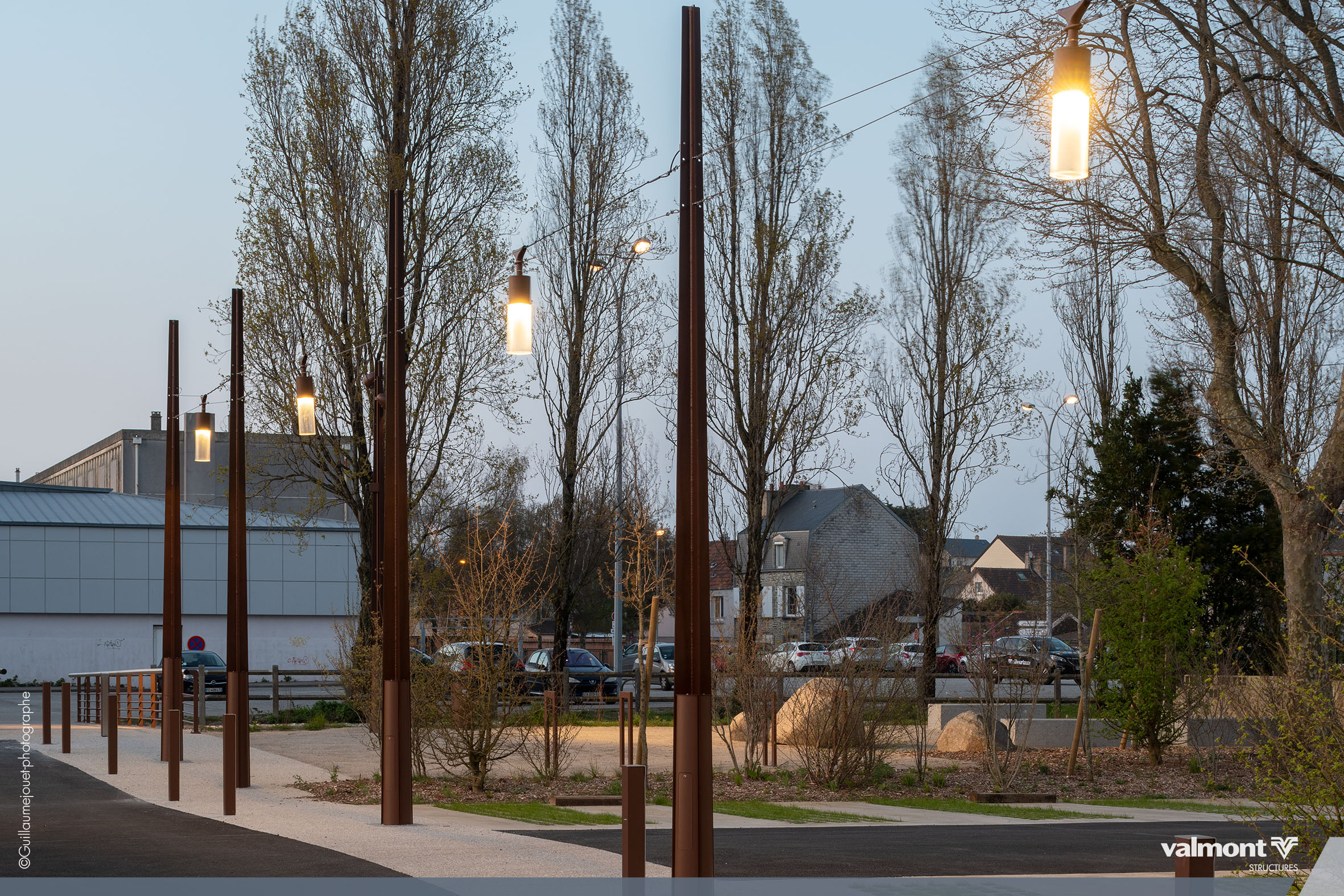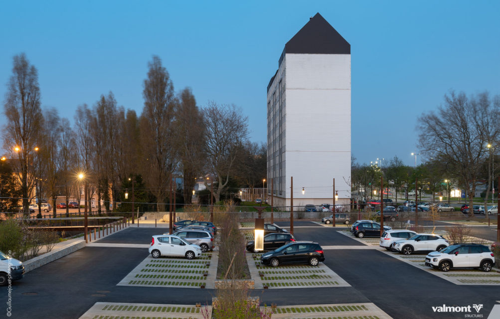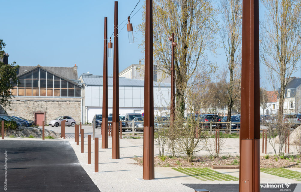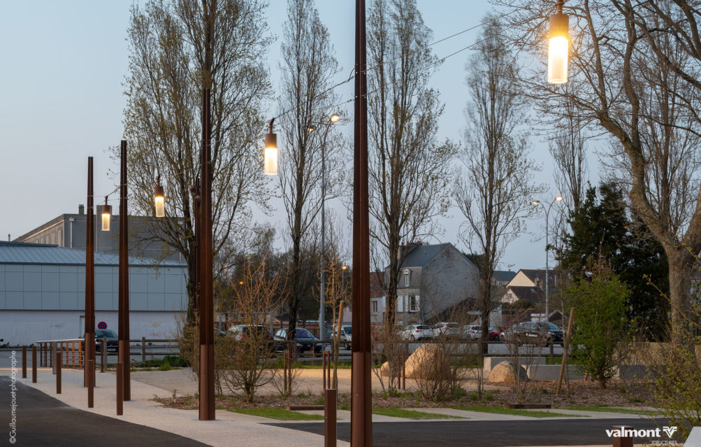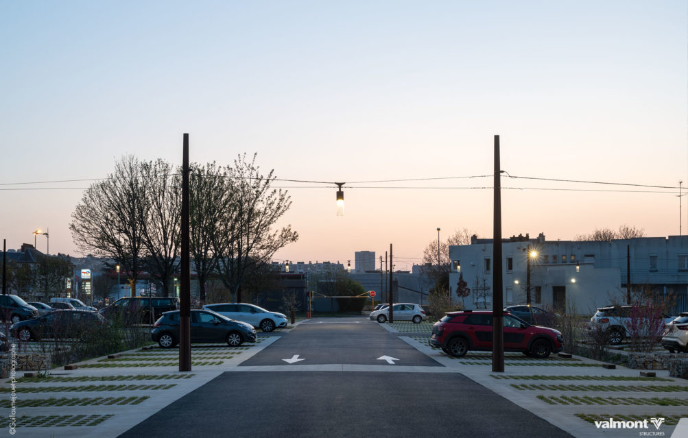 Initialement dessiné pour supporter les Lignes Aériennes de Contact pour les tramways, la déclinaison du mat X en version Lighting s’intègre parfaitement dans cet aménagement de stationnements. Son profil aux lignes contemporaines sait à la fois se faire oublier dans ce parking aux dimensions paysagères étudiées, mais sait aussi délimiter avec une identité marquée les différents espaces.