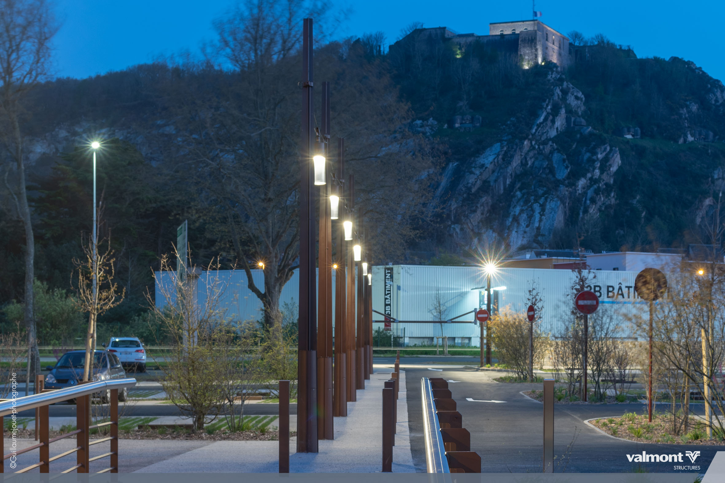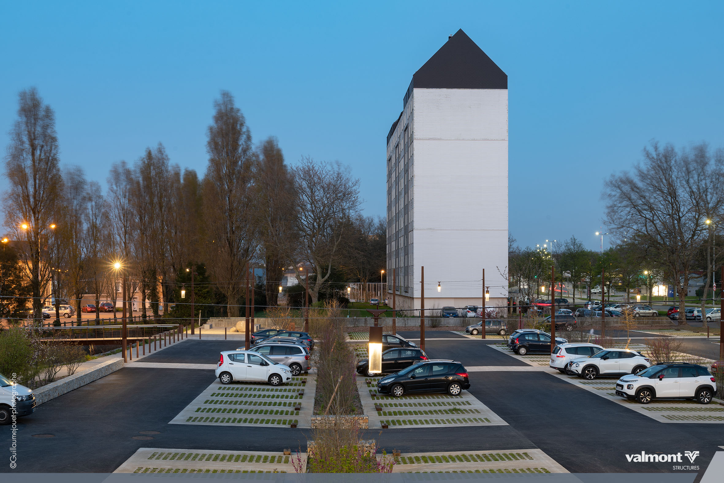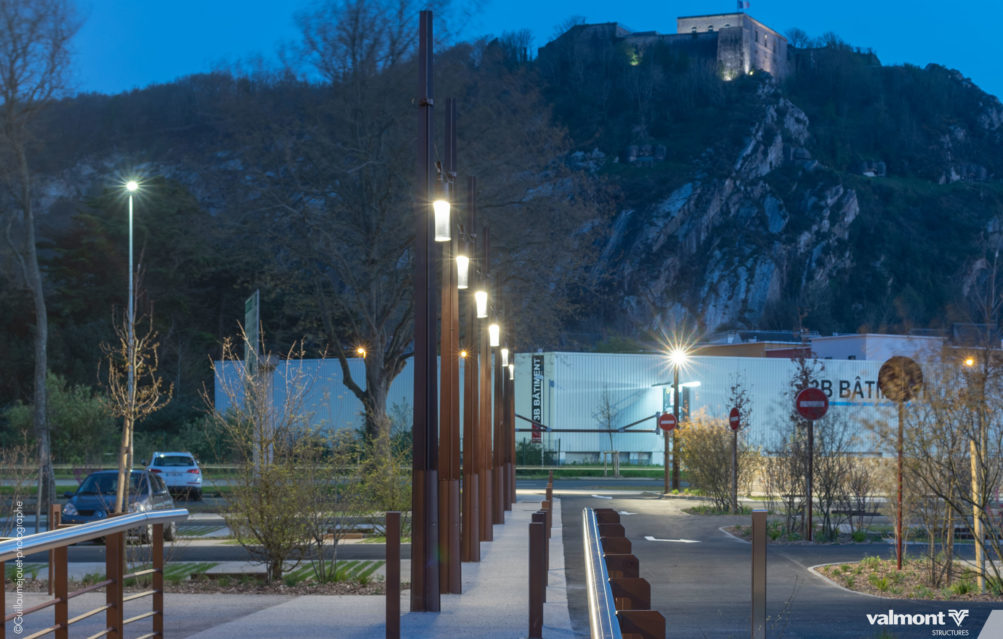 Initialement dessiné pour supporter les Lignes Aériennes de Contact pour les tramways, la déclinaison du mat X en version Lighting s’intègre parfaitement dans cet aménagement de stationnements. Son profil aux lignes contemporaines sait à la fois se faire oublier dans ce parking aux dimensions paysagères étudiées, mais sait aussi délimiter avec une identité marquée les différents espaces.