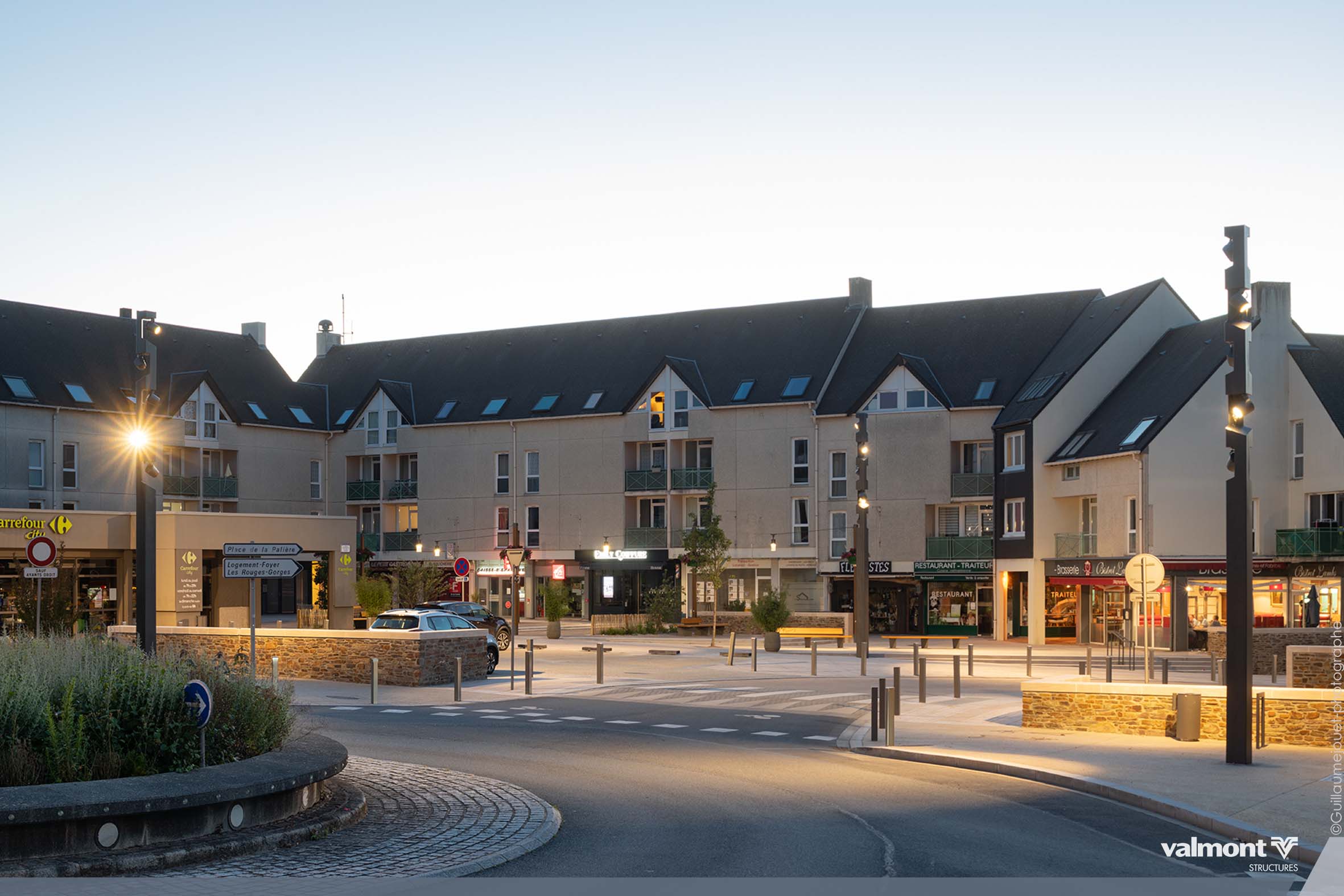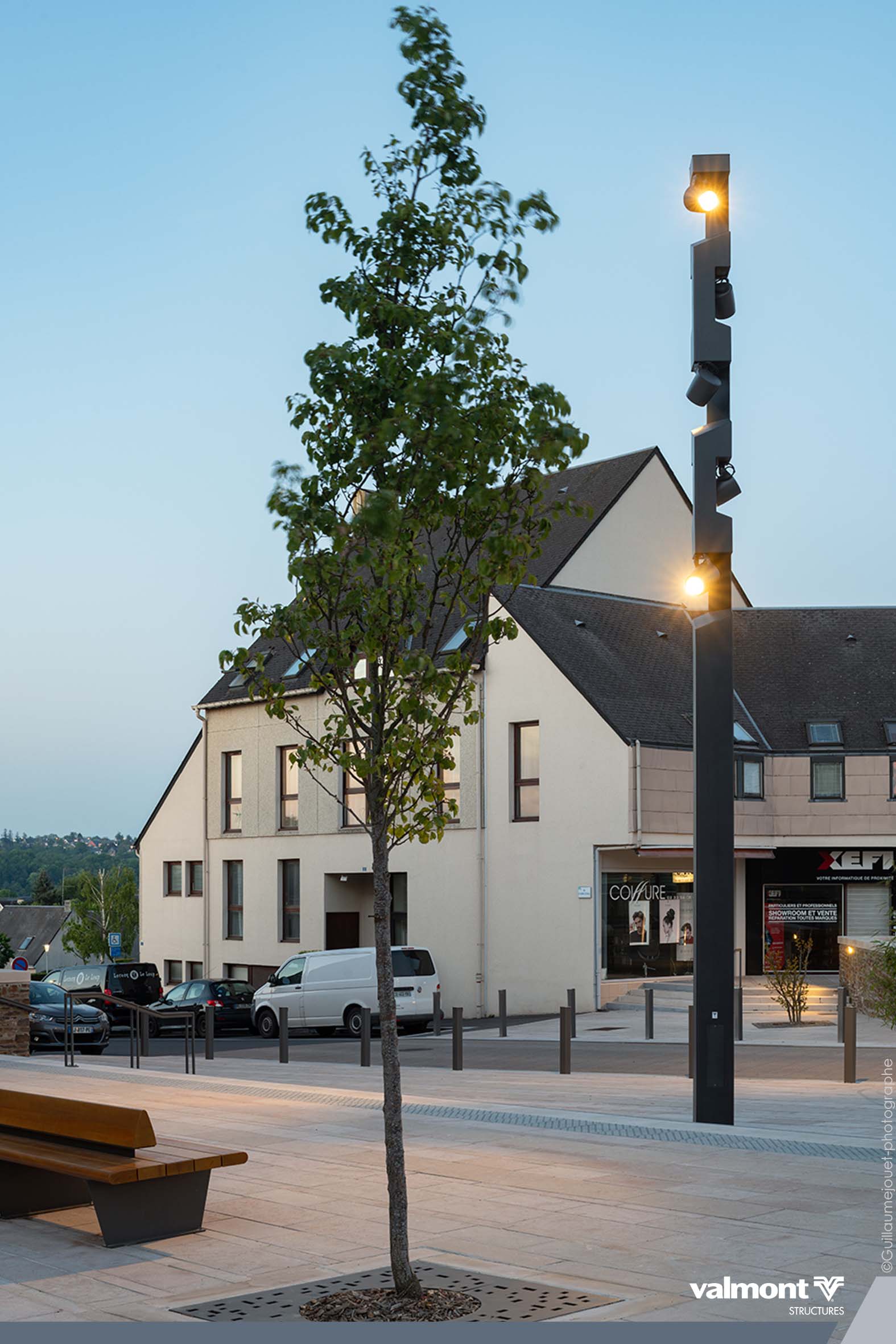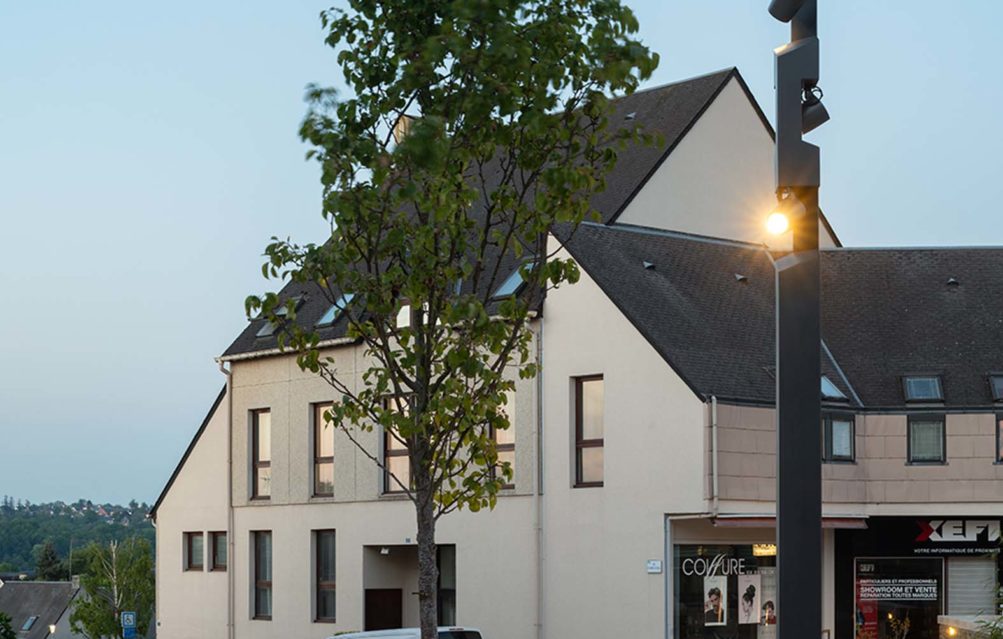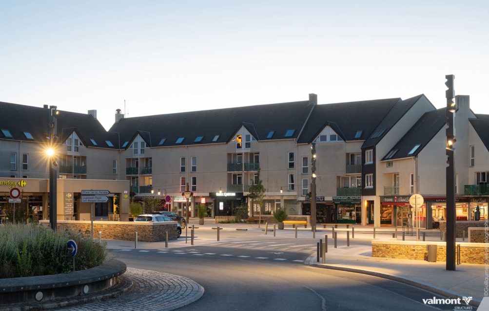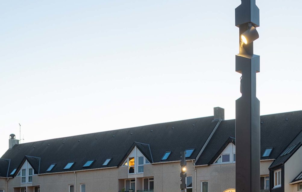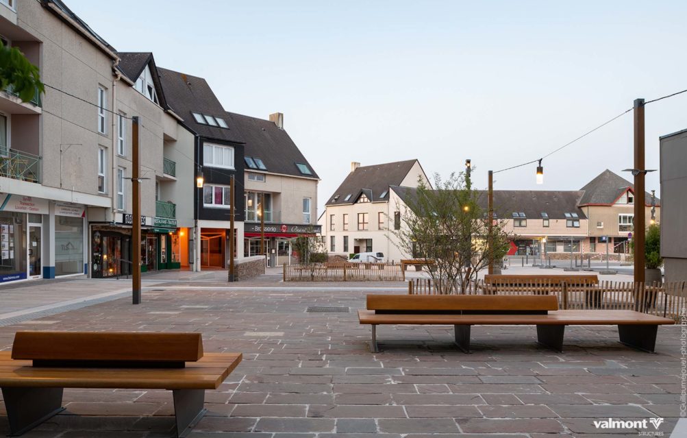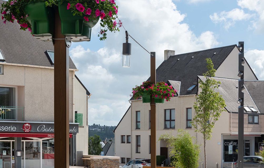 Se réapproprier “la place du village”, une belle initiative pour re-centrer les lieux de vie au cœur des communes et villages Marchés et festivités prendront un air de guiguette avec la mise en lumière des pourtours de la place, supportée par des mats carrés en acier sublimés bois aux tonalités faisant écho au mobilier urbain. Une touche plus graphique ponctue également le lieu avec des mâts aux découpes intégrant des projecteurs, assurant ainsi sécurité et mise en valeur du site. Un bel exemple où authenticité et modernité se côtoient en toute harmonie.