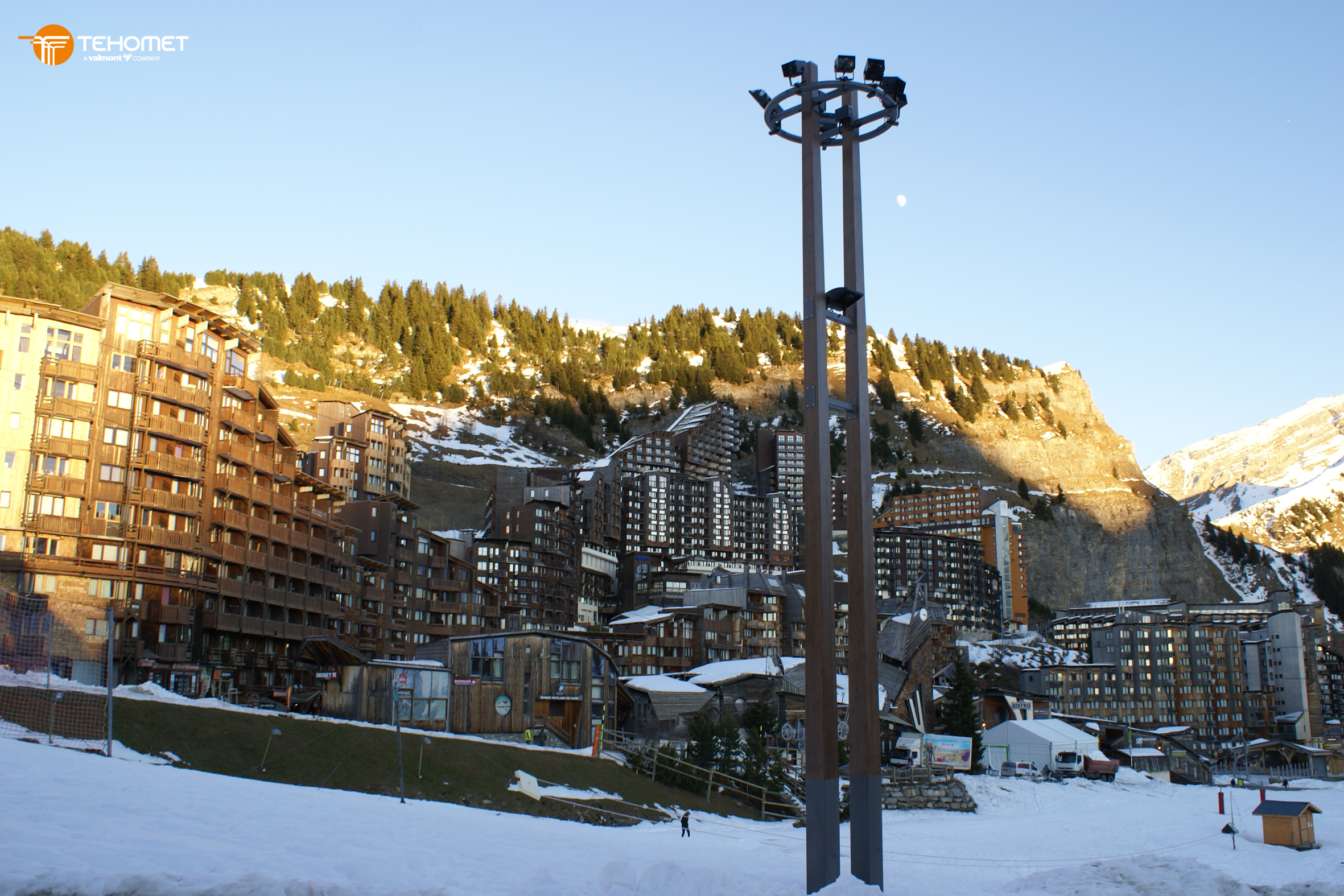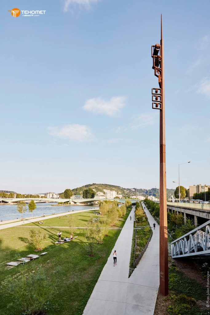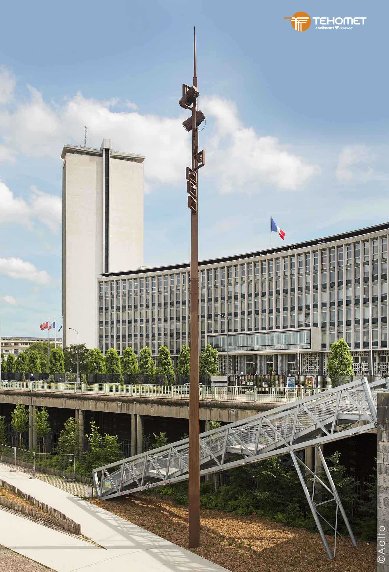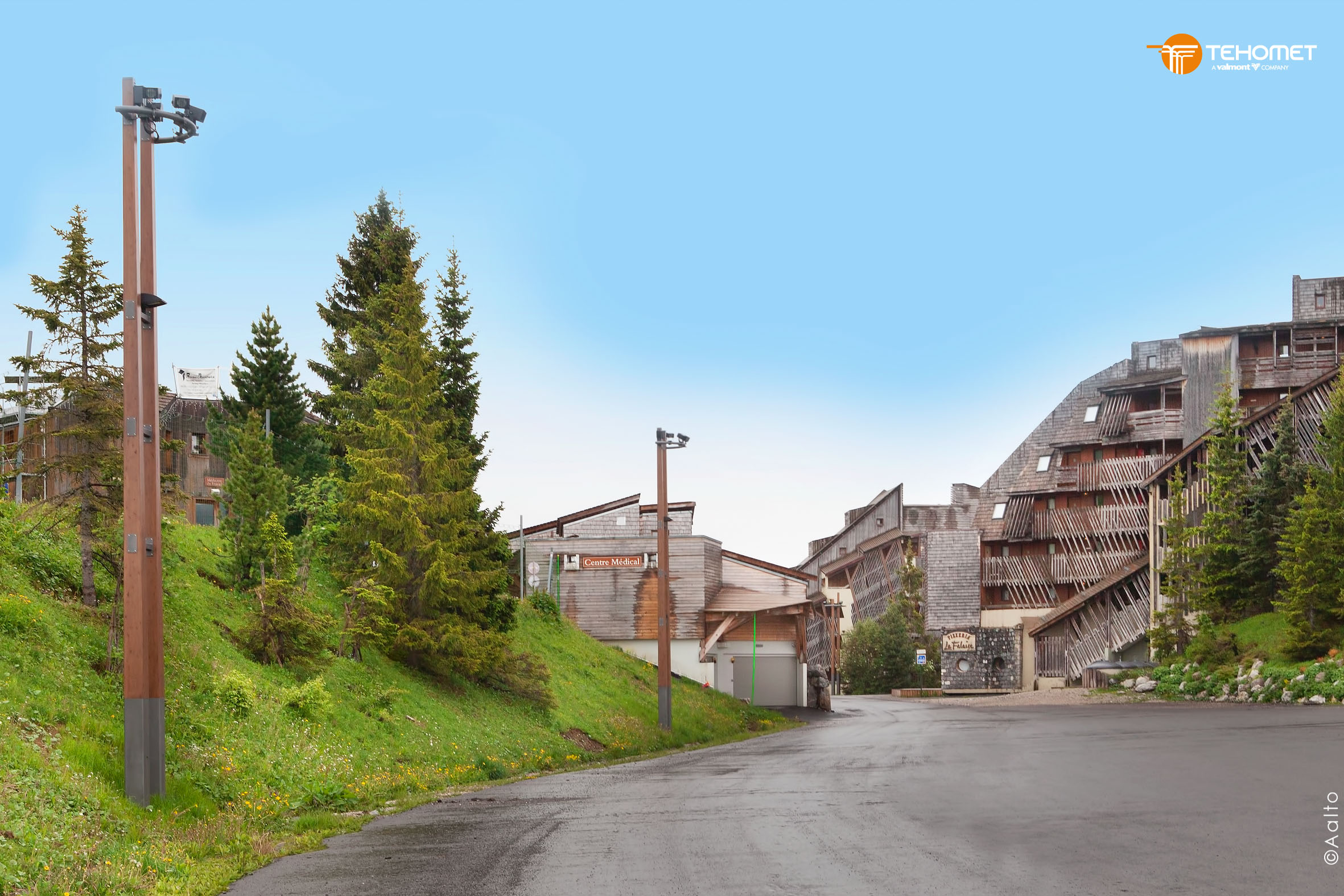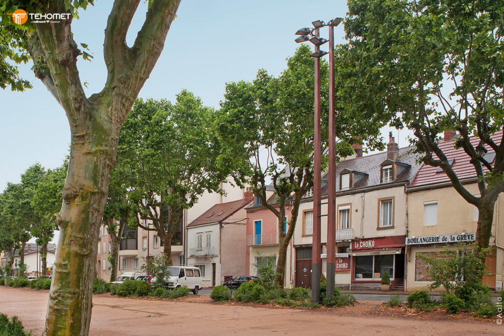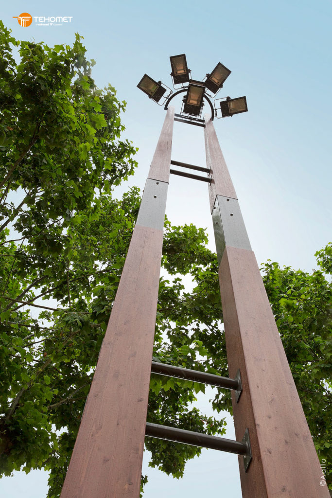 Nelio est un mât bois support projecteurs de section carrée conique.