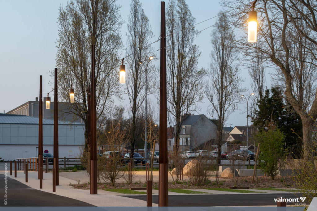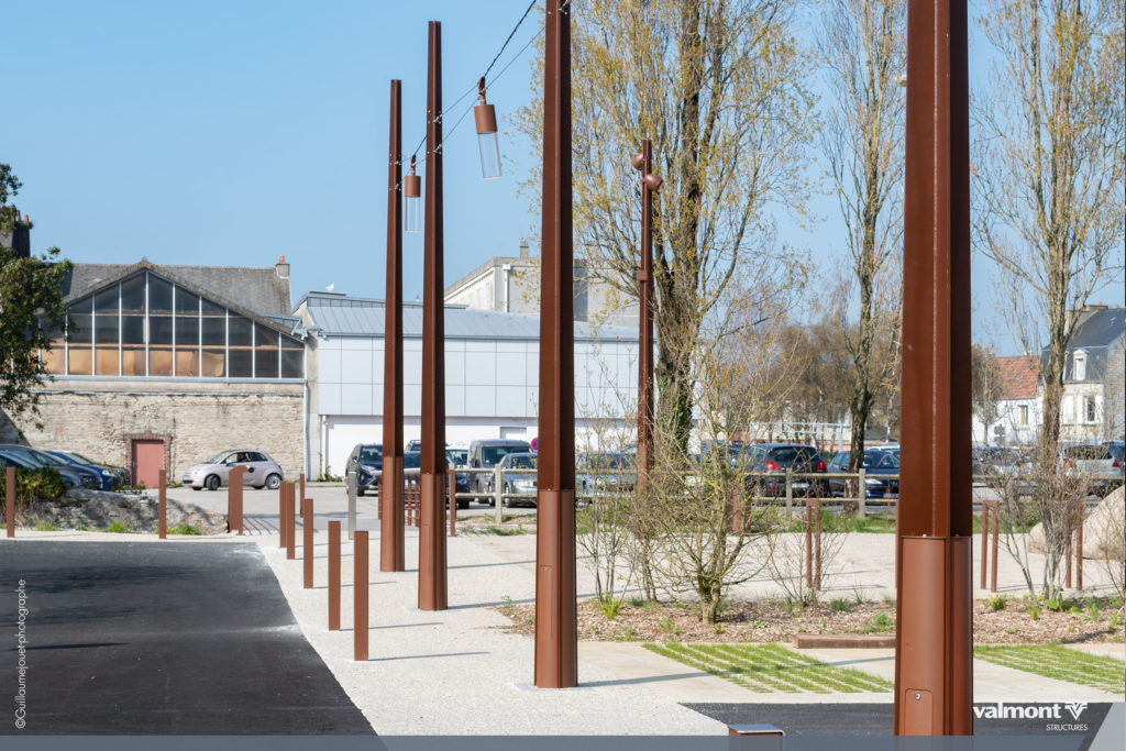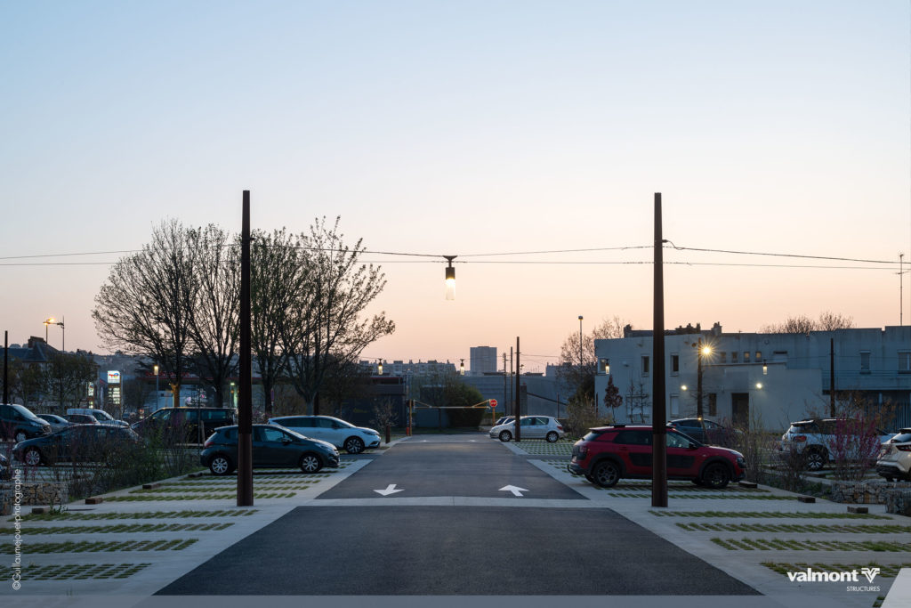 Initialement dessiné pour supporter les Lignes Aériennes de Contact pour les tramways, la déclinaison du mat X en version Lighting s’intègre parfaitement dans cet aménagement de stationnements.