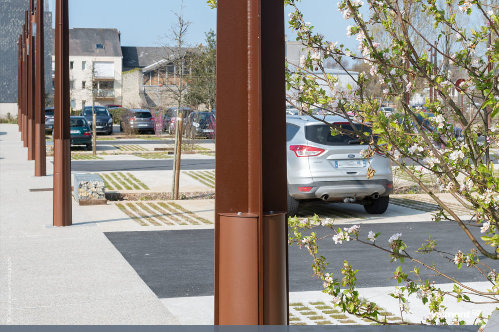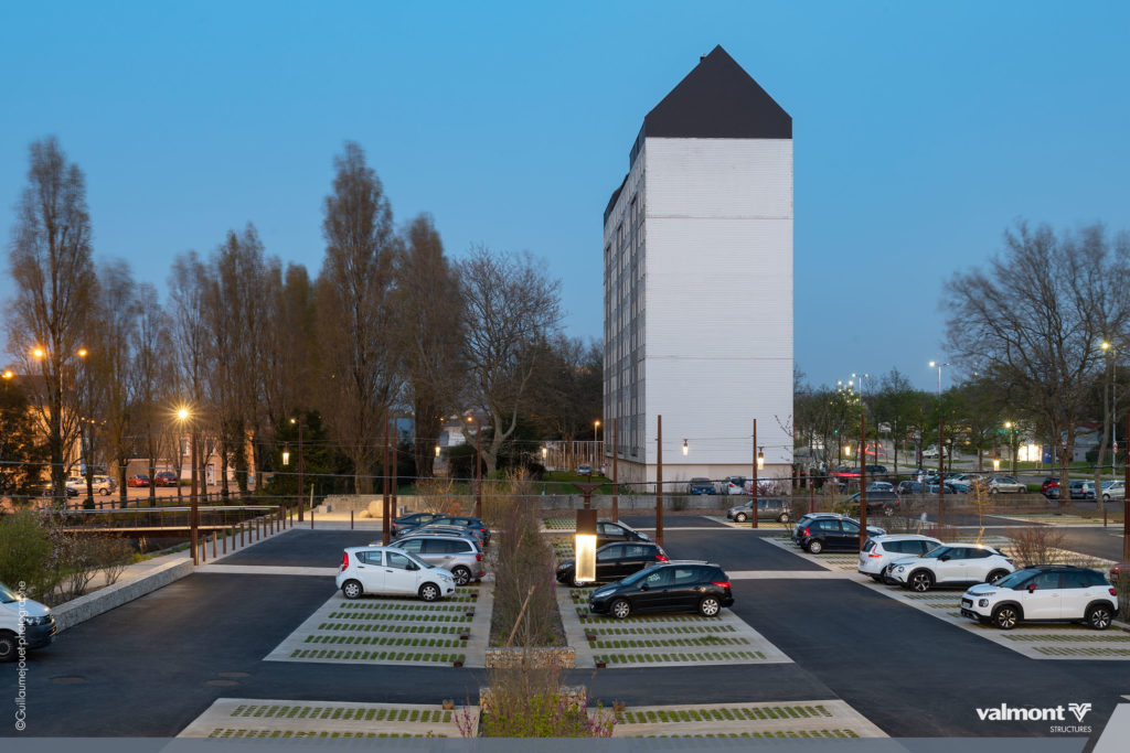 Son profil aux lignes contemporaines sait à la fois se faire oublier dans ce parking aux dimensions paysagères étudiées, mais sait aussi délimiter avec une identité marquée les différents espaces.