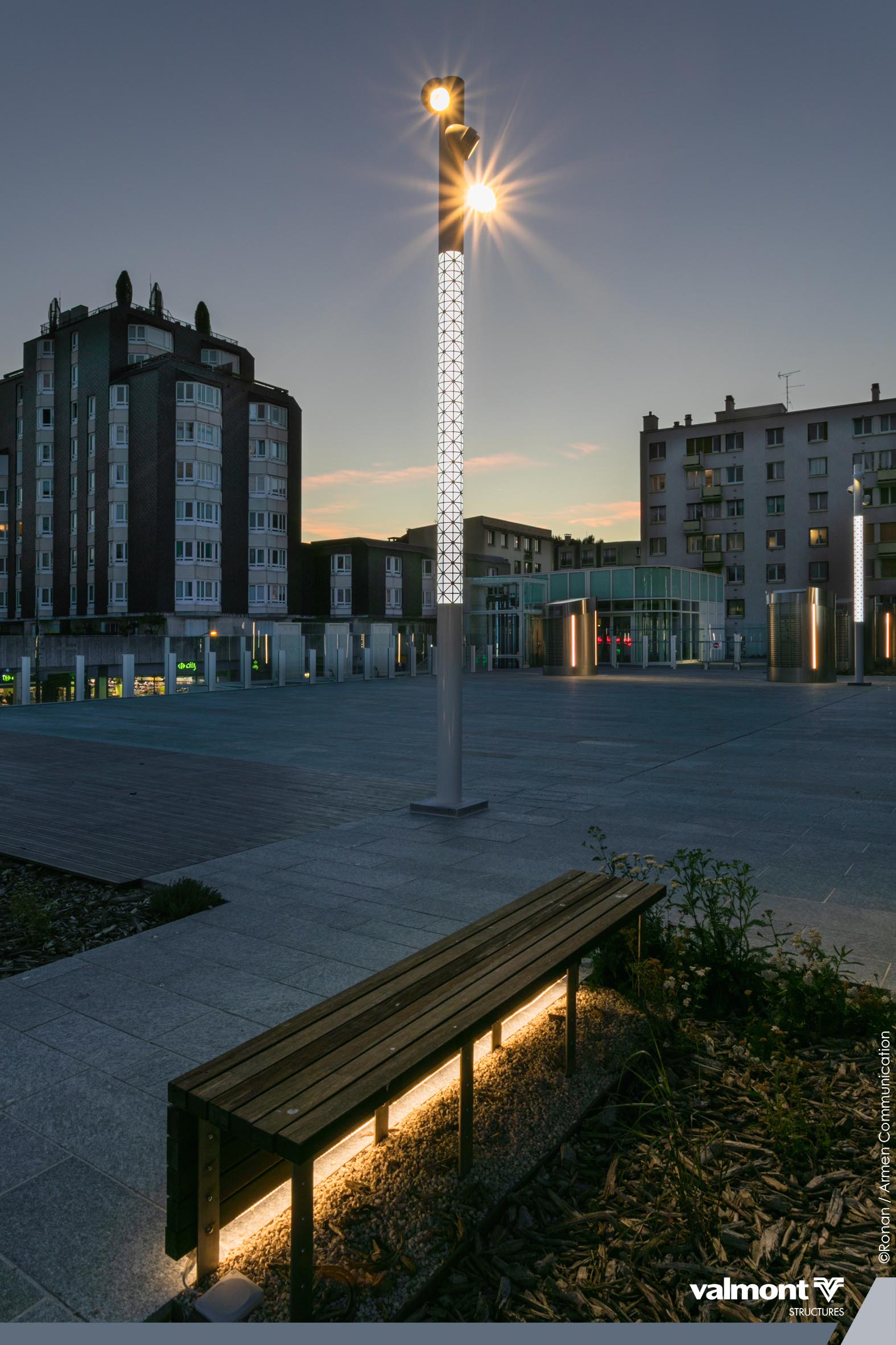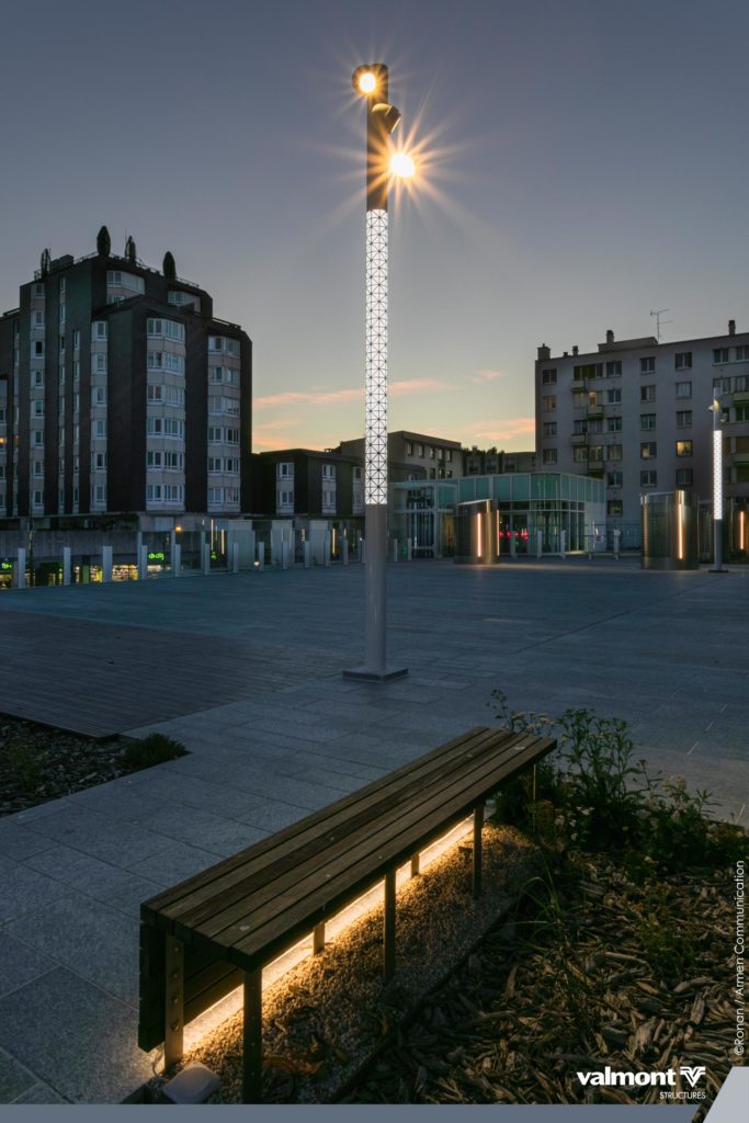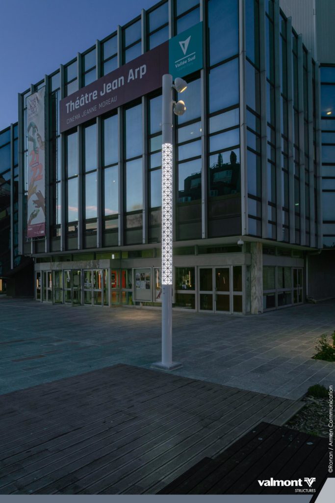 Réaménagement des espaces extérieurs du Centre Culturel Jean Arp avec une intégration douce de l’éclairage dans un environnement paysager.