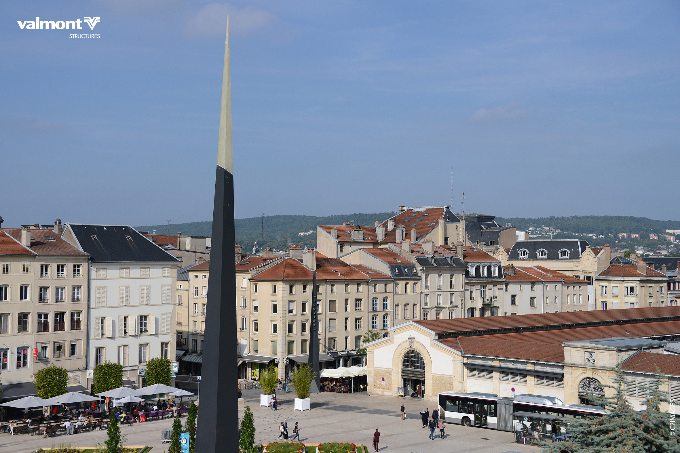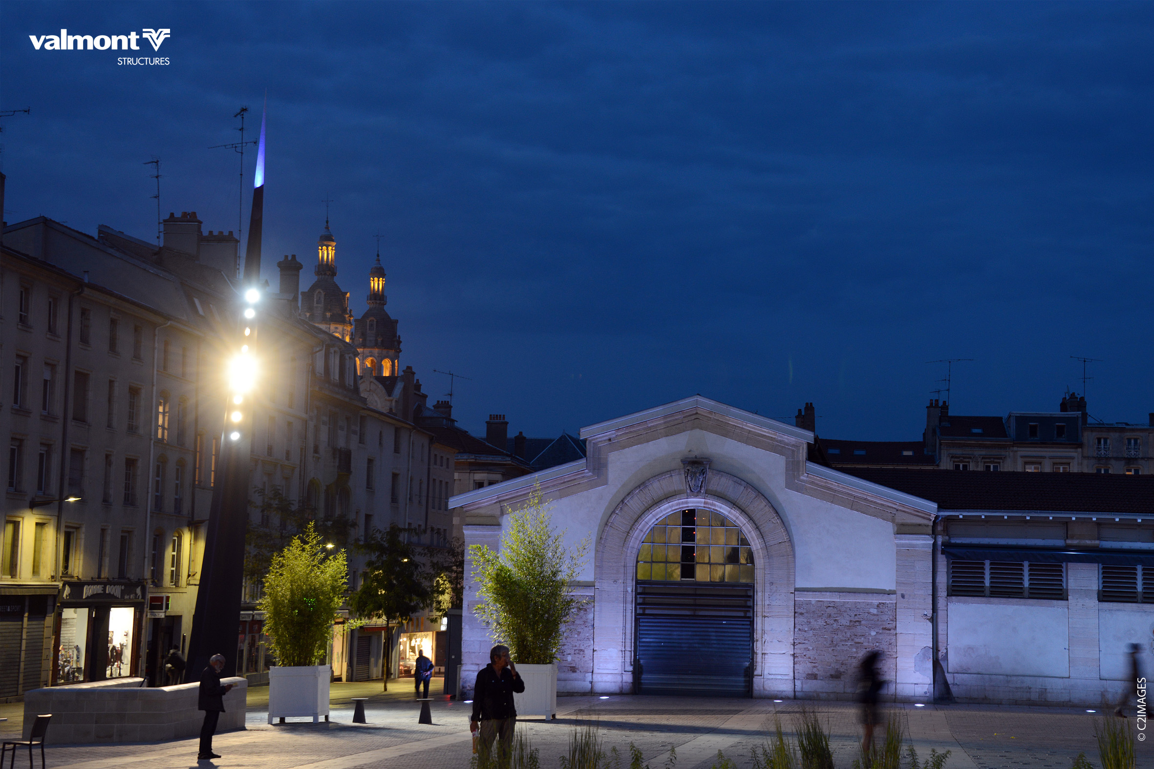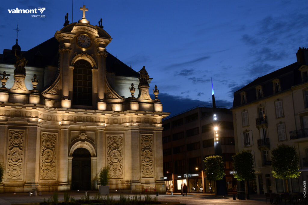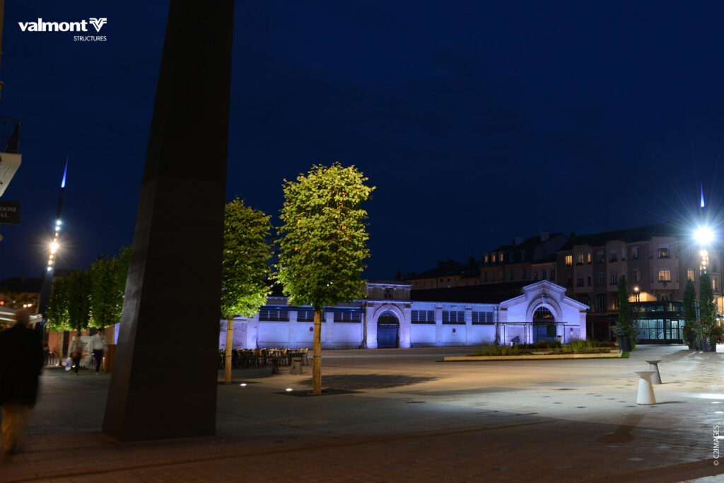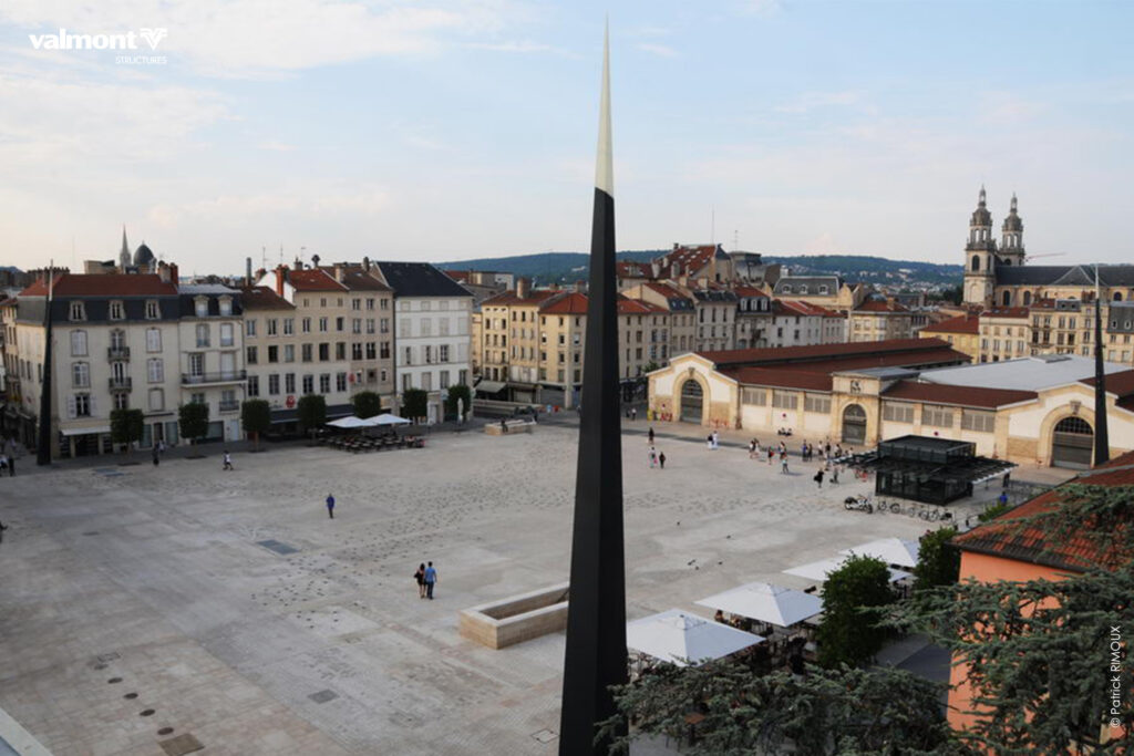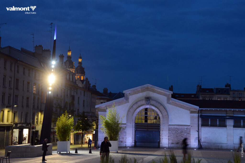 Leur design se fera en écho avec l’architecture de l’église Saint Sébastien qui borde la place,ces mâts éclairant pleinement l’espace